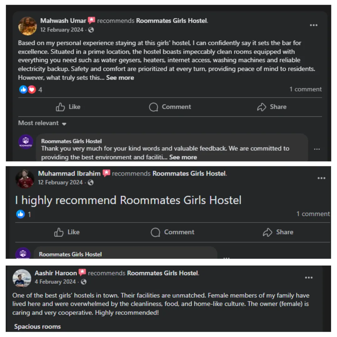 Finding a reliable and safe women’s hostel in Islamabad is often challenging. Many places compromise on discipline, food quality, or overall living standards. Our room mates facility is designed to provide a structured, value-based, and peaceful living environment where women can focus on their studies or professional life without stress. This is not overcrowded hostel living. It is a well-managed residence built on safety, discipline, and mutual respect.